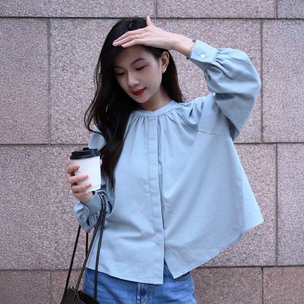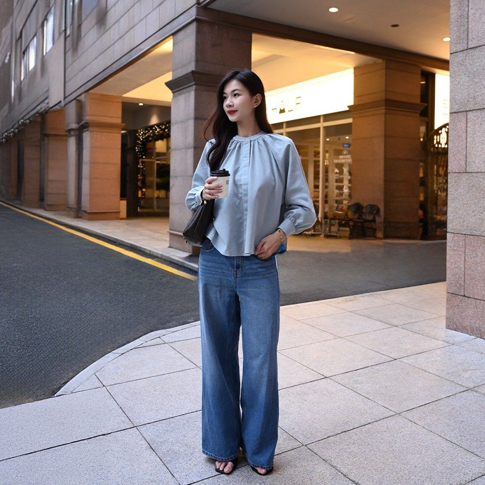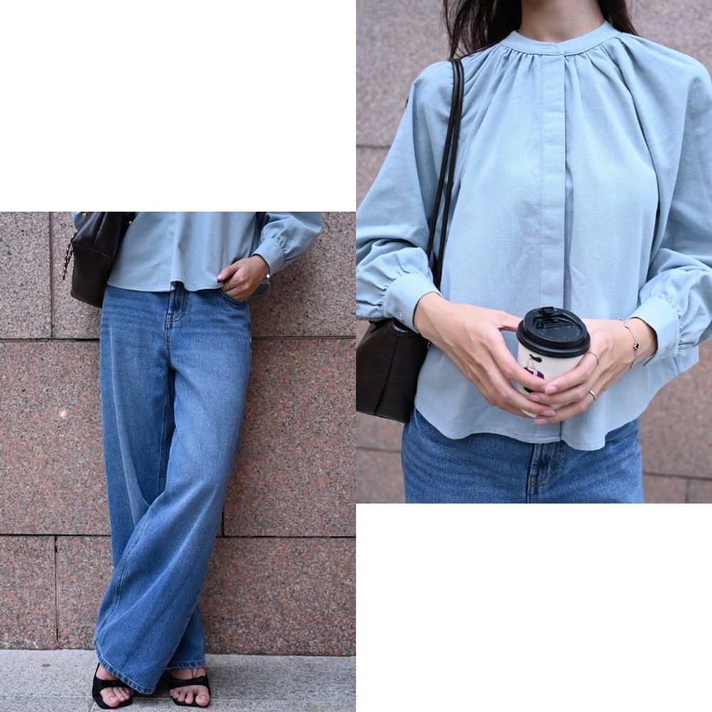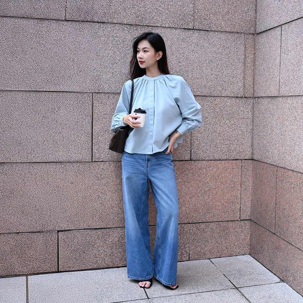 Set sơ mi tay bồng chất linen kết hợp quần jeans wide-leg tôn dáng, tạo vẻ ngoài tối giản nhưng đầy tinh tế.