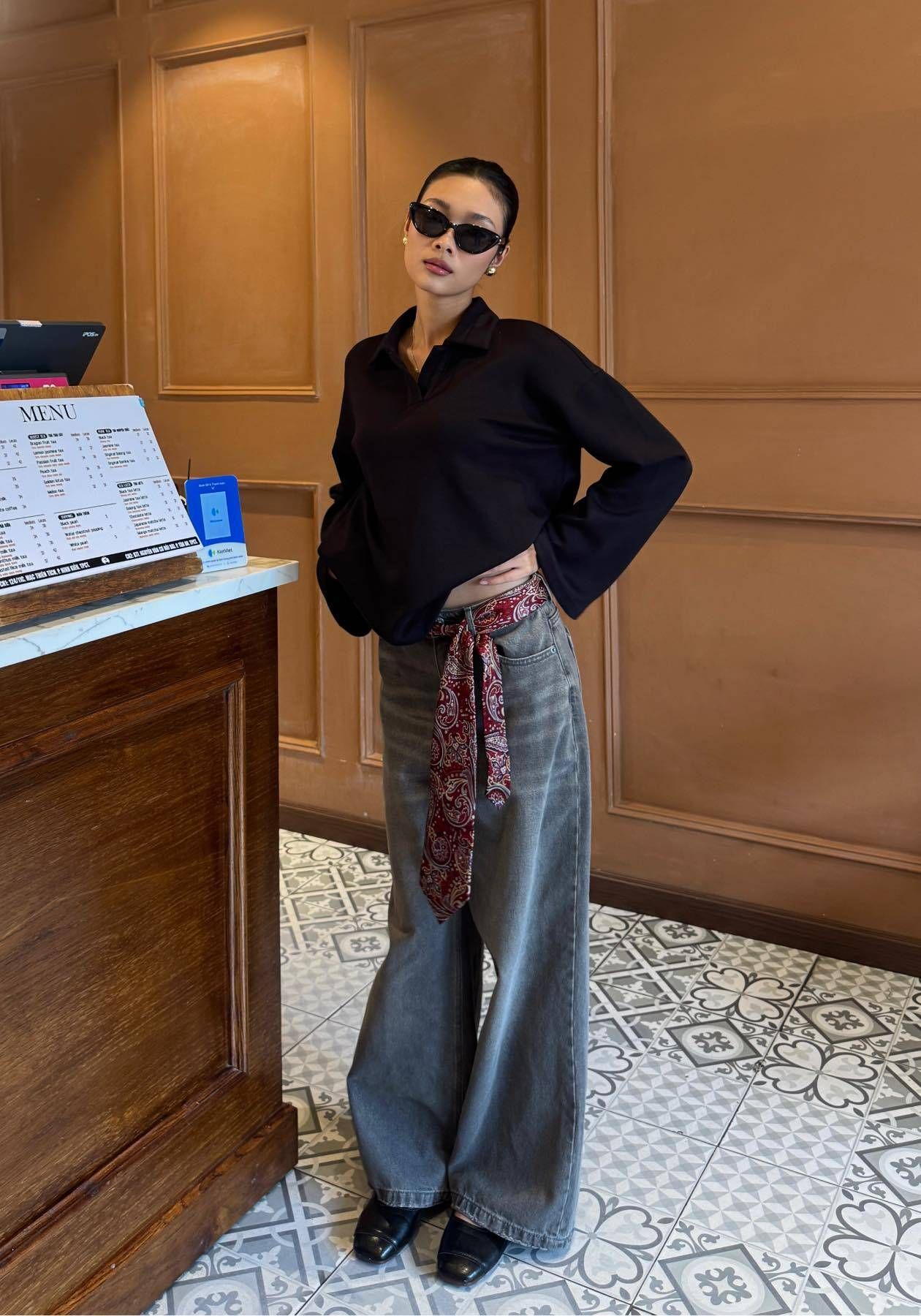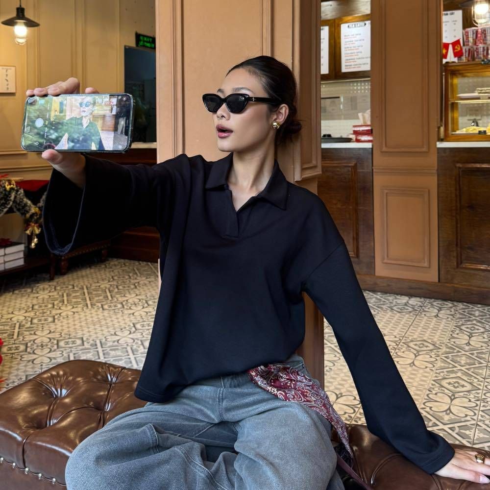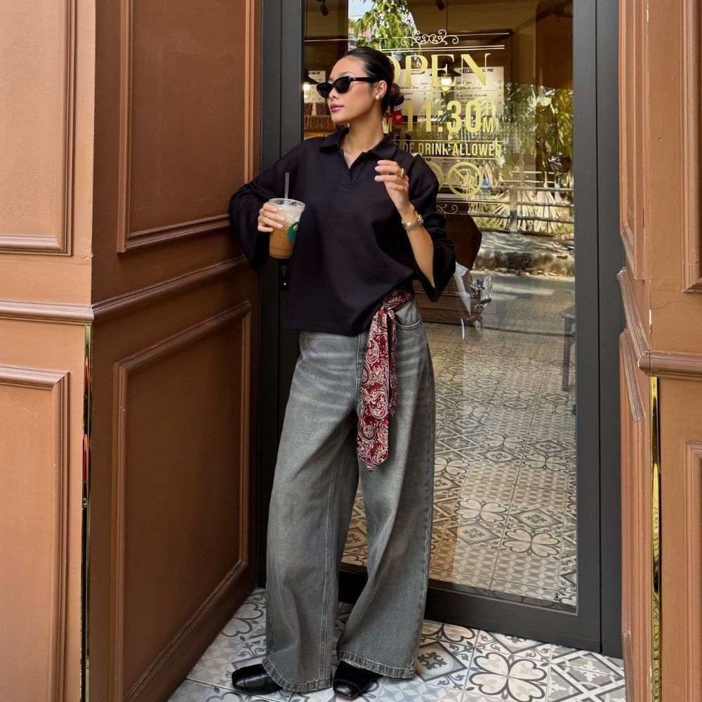 Áo nỉ scuba mềm mịn, cổ V nhẹ nhàng, tay loe thanh lịch. Kết hợp cùng quần jeans wide-leg tôn dáng, tạo nên tổng thể hiện đại và effortlessly chic.