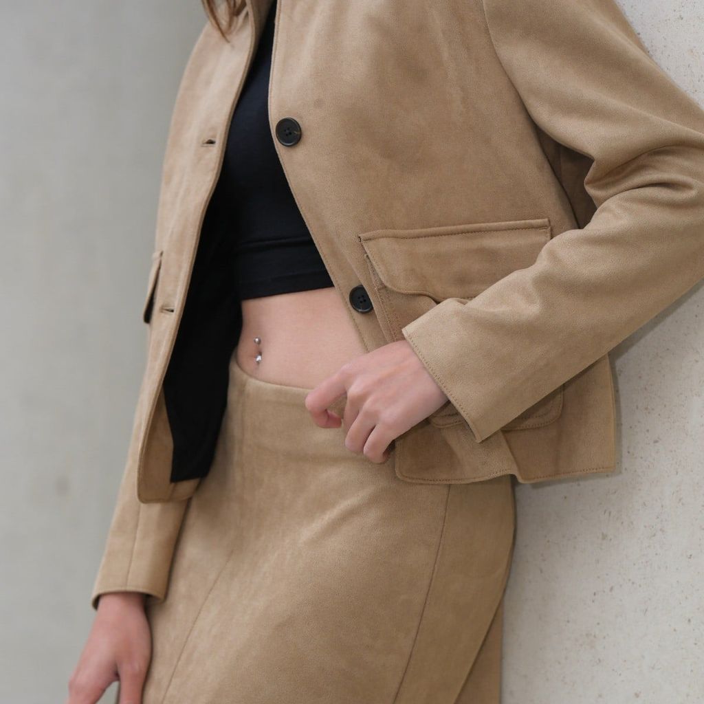 Set da lộn với gam nâu ấm áp cùng phom dáng thanh lịch tạo nên vẻ ngoài mềm mại nhưng đầy nội lực. Chất liệu suede nhẹ nhàng ôm theo chuyển động, mang lại cảm giác tinh tế, hiện đại và đủ thoải mái cho nhịp sống thường ngày.
