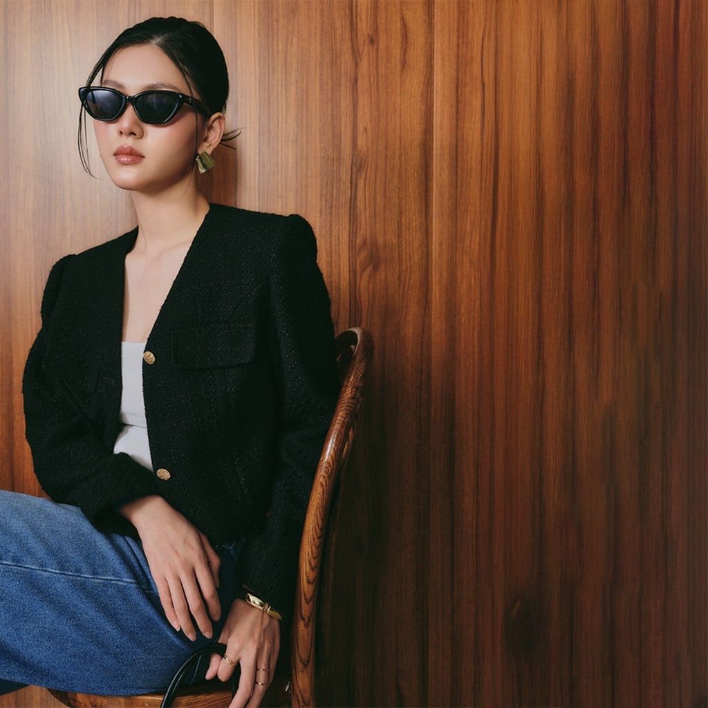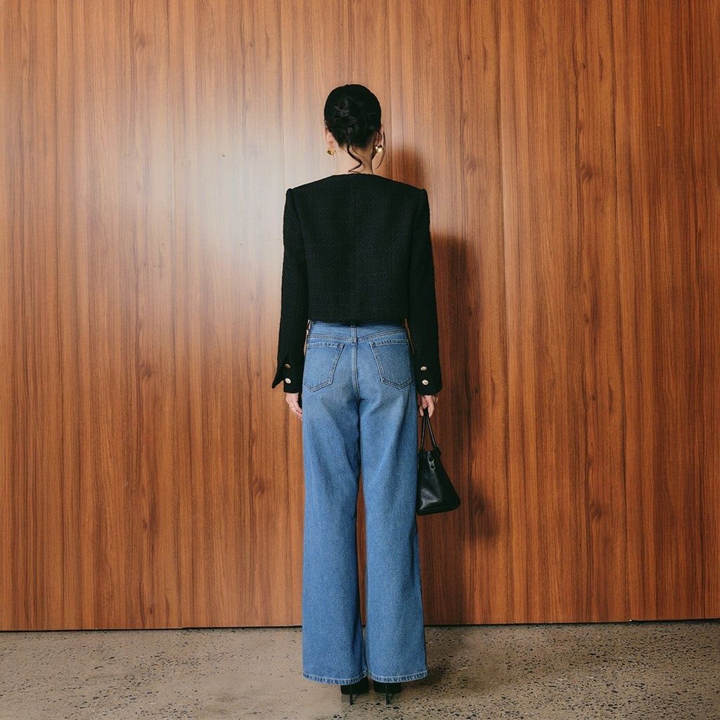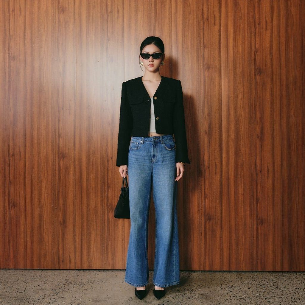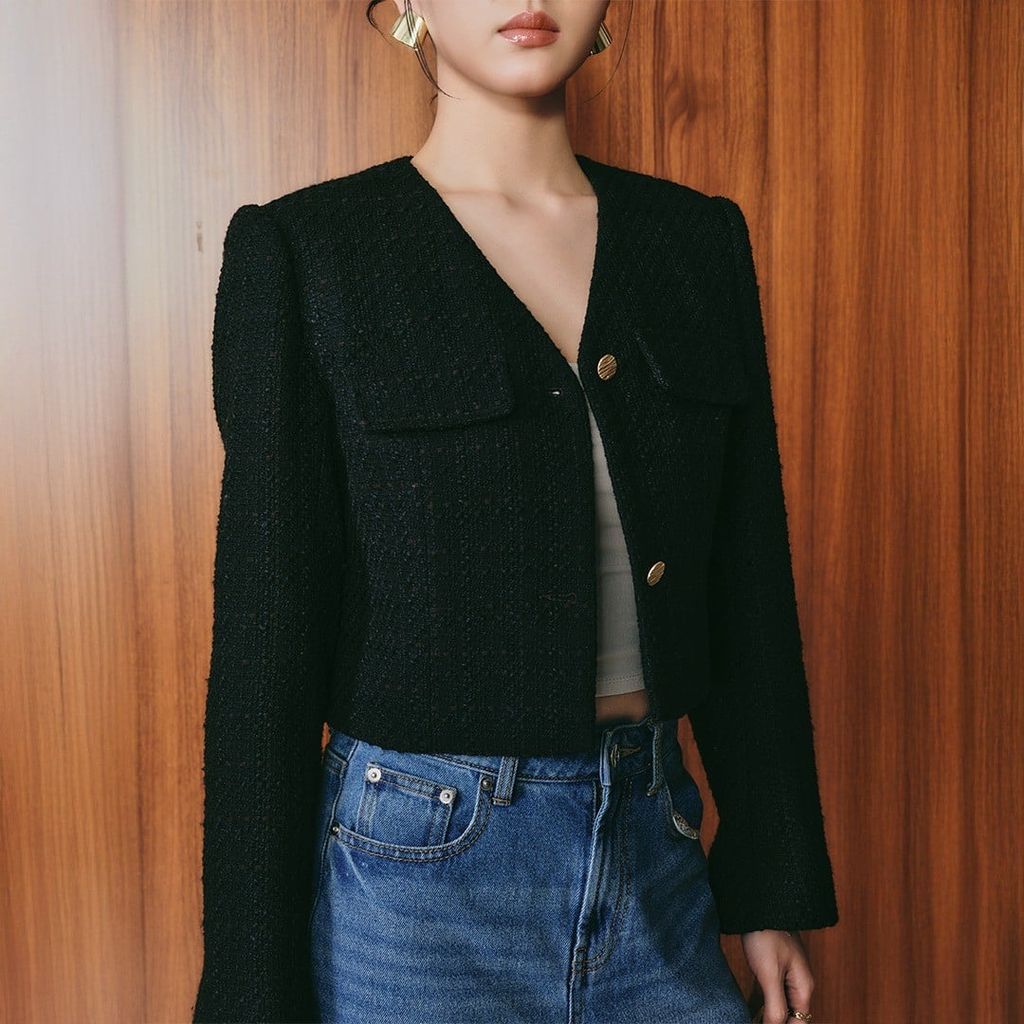 Blazer dạ tweed dáng crop màu đen — cấu trúc gọn gàng, bề mặt mềm nhưng vẫn giữ phom chuẩn.