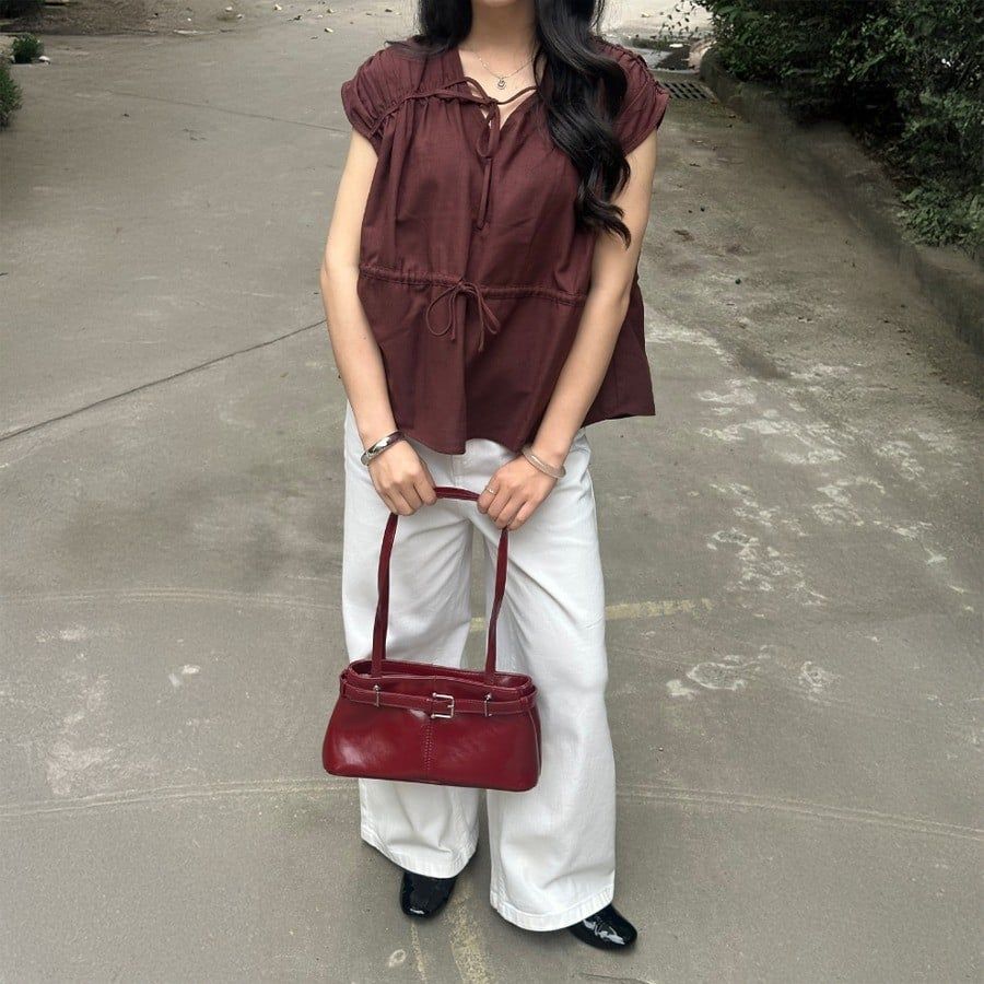 Áo linen với chi tiết dây rút cách điệu, tạo nên phom dáng mềm mại và thanh lịch.